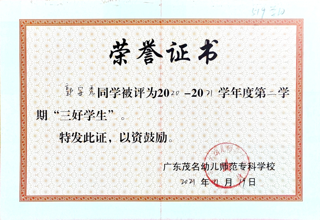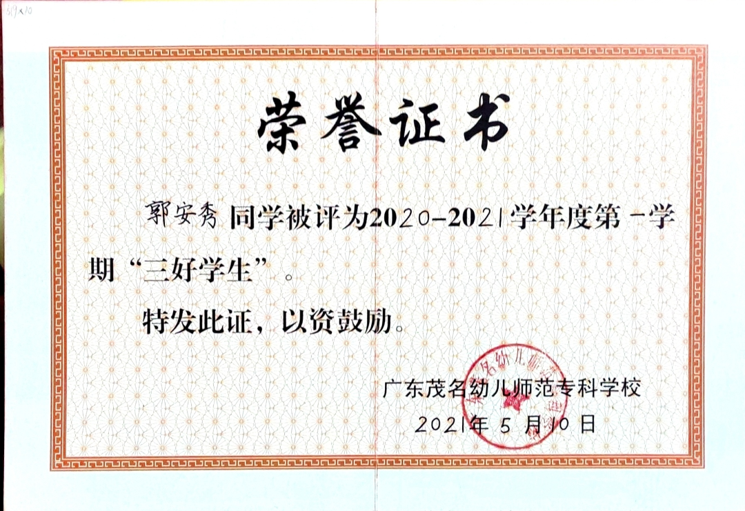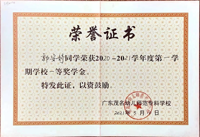 2020-2021学年获得校一等奖学金并被评为“三好学生”;