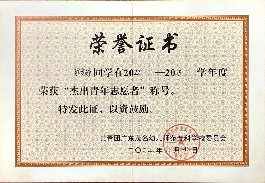 2022-2023学年被评为“杰出青年志愿者”、“疫情防控杰出青年志愿者”;
