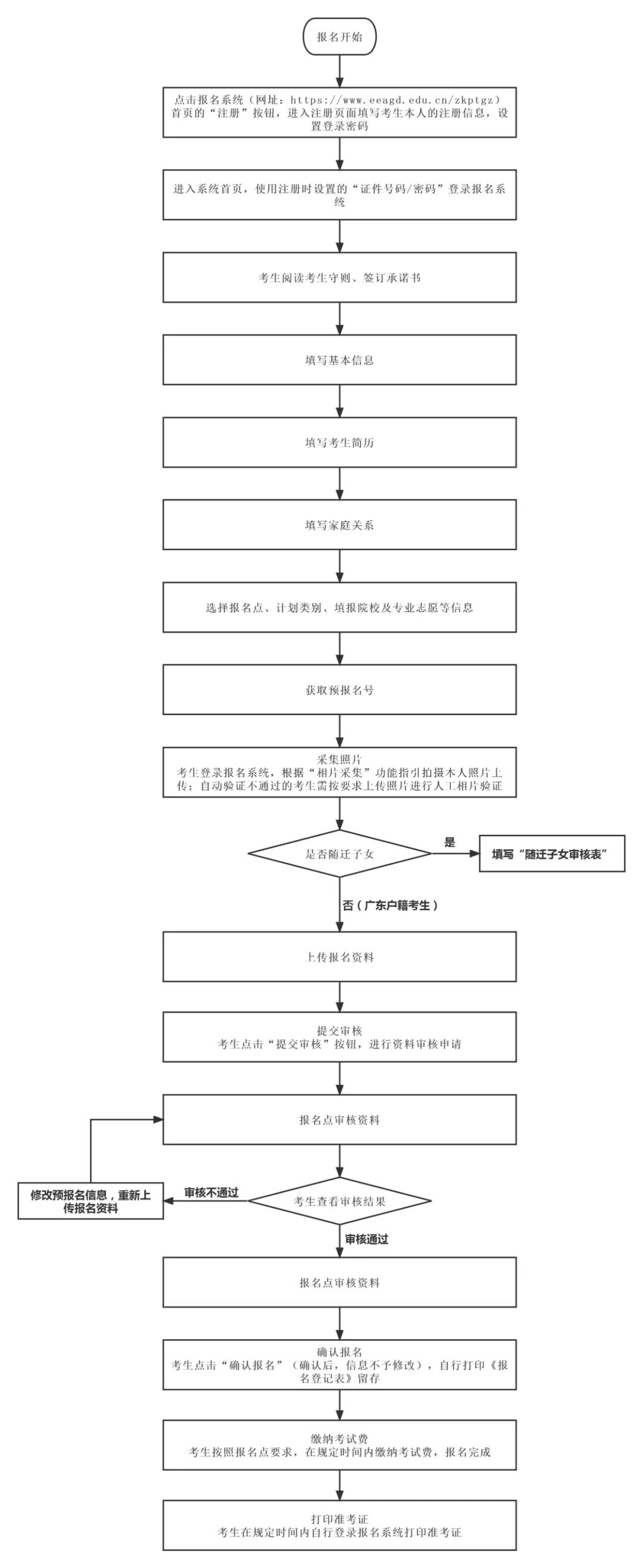 (二)网上确认报名(3月23-25日):考生报考信息在提交审核前可以多次登录系统进行修改,一定要逐字核实考生本人的姓名、身份证号码、性别、就读中学、报考志愿、考试地点等信息;参加术科(面试)考试的考生还要认真核对术科(面试)考试信息(提醒:报考我校学前教育专业的考生要参加面试),审核通过后不能再进行修改。院校审核不通过的,考生还需在3月23日前修改补充上传资料并重新提交审核。经院校网上审核通过后,考生必须重新登录报名系统进行网上确认。没有确认的,视为自动放弃报名资格,不予安排考试。(三)报名操作流程图04
