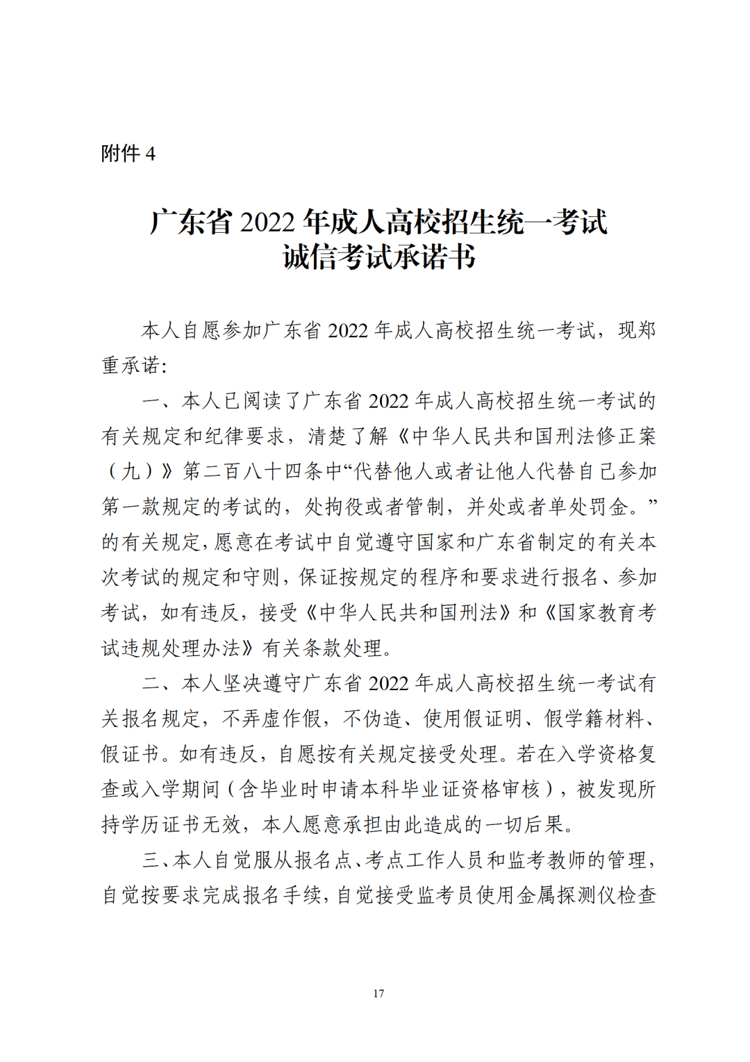 4.广东省2022年成人高校招生统一考试诚信考试承诺书