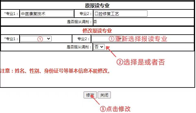 第二步:点击页面最下方需要修改的功能板块,如“修改报读专业”,在页面下方“修改报读专业”红色字体栏目中填入专业1、专业2及“是否服从调剂”等信息。