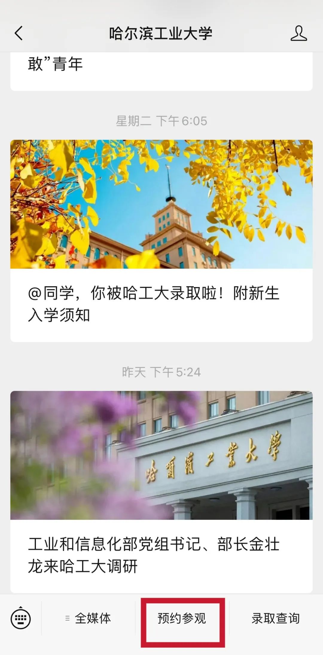 校园参观,周一至周五需在网上实名预约,每日限1000个名额,达到每日限额人数为止。参观人员持身份证或户口簿、护照等有效身份证件从指定校门出入。一校区西大直街校门、二校区黄河路校门、科学园和兴路校门为指定参观通道。个人预约参观:通过“哈尔滨工业大学”官方微信公众号进行实名预约,可预约当天及未来7天参观。每人最多可为同行的另外3人预约。个人预约成功后,持有效身份证件从校门通道经身份核验和安检后进校参观,仅限当次入校参观有效。