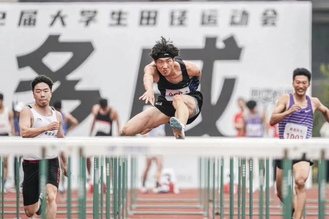 甄毅在大学生田径运动会上展现“跨栏飞人”