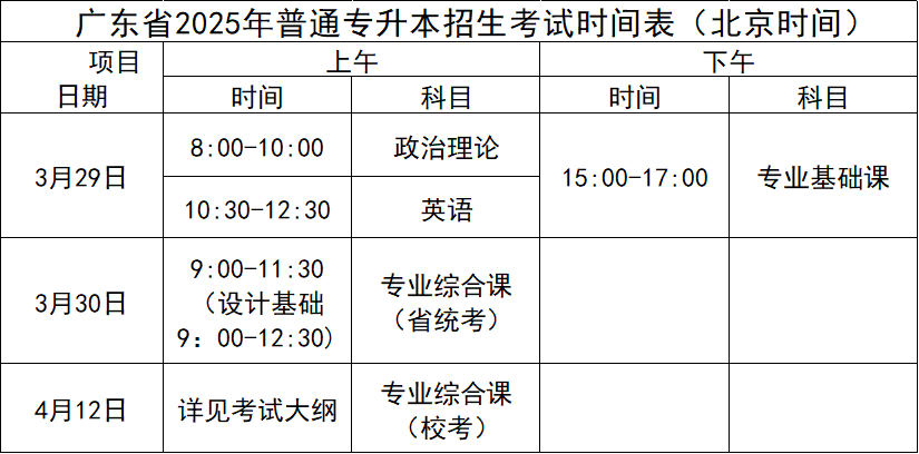 (四)广东石油化工学院普通专升本专业综合课(校考)考试时间为2024年4月12日(星期六),考试时间具体安排详见考试大纲。普通专升本招生考试时间为2025年3月29日(星期六)至30日(星期日)两天,具体安排见下表: