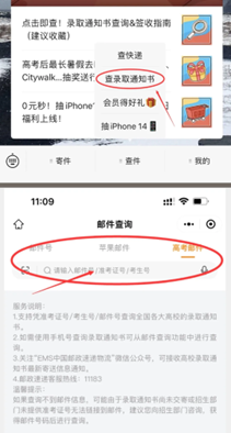 点击【EMS中国邮政速递物流】公众号菜单栏的【查件】界面,选择【查录取通知书】,选择【高考邮件】,输入考生号,按提示输入高考报名时预留的收件人手机号后四位进行验证,即可查到关联的通知书邮件的物流信息。