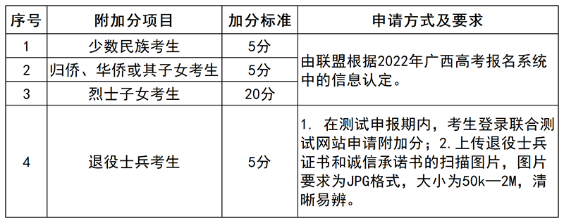 说明:①表中附加分项目及加分标准仅适用于本次联盟院校的高职单招联合测试;②同一考生符合多项加分条件的,只按其中最高一项加分分值计入总分。