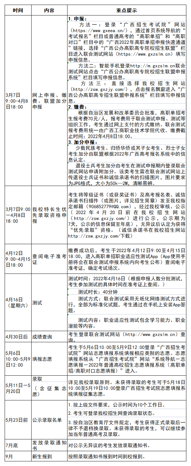 为贯彻落实自治区招生考试委员会办公室下发的《关于做好我区2022年高等职业院校单独考试招生和高等职业院校对口中等职业学校毕业生自主招生工作的通知》(桂招考委办〔2022〕2号)文件精神,进一步探索人才选拔途径,拓宽优秀人才的选拔渠道,促进高职教育的健康发展,广西职业技术学院2022年继续参加35所广西公办高职高专院校开展的高等职业院校单独考试招生(简称高职单招),“网上申报、网上缴费、网上测试、综合评定、择优录取”的原则开展单独考试招生联合测试工作,联合测试将采用网络测试形式进行,现将简章公布如下: