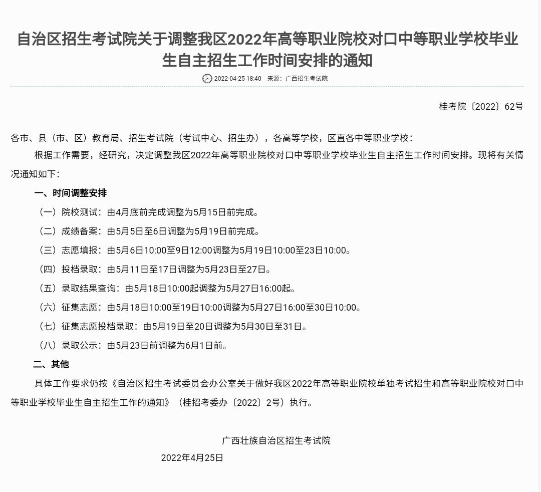 自治区招生考试院关于调整我区2022年高等职业院校对口中等职业学校毕业生自主招生工作时间安排的通知