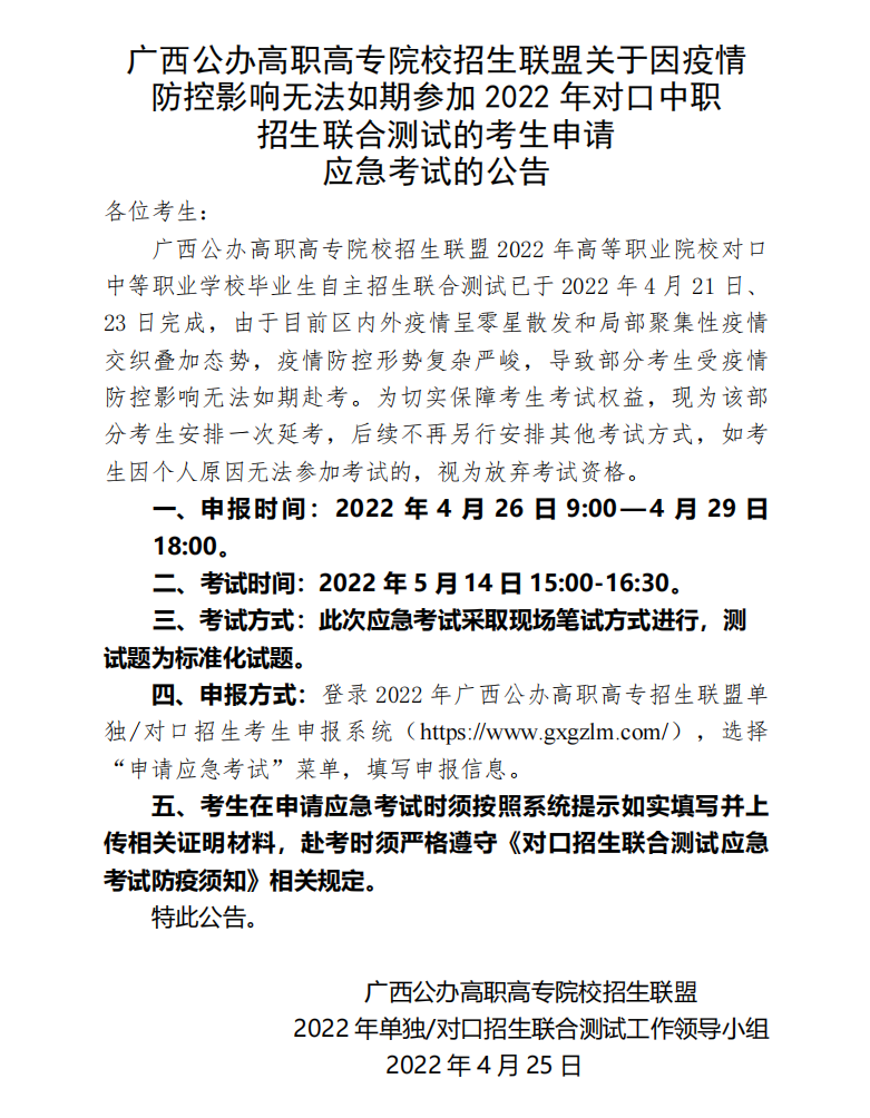关于因疫情防控影响无法如期参加对口中职招生联合测试的考生申请应急考试的公告