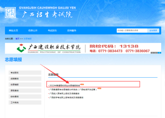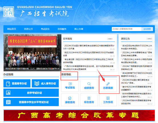 登录“广西招生考试院”网站(https://www.gxeea.cn/)“系统导航—志愿填报—2022年普通高校招生志愿填报系统”填报志愿。