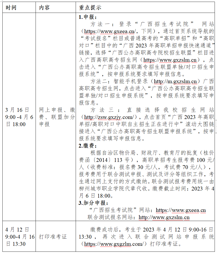 根据自治区物价局、财政厅、教育厅的批复(桂价费函〔2014〕113号),高职单招考生报考费100元/人(收费标准:报名费30元/人,考试费70元/人),报考费用于联合测试申报、测试及评分等组织工作,考生通过网上支付的方式缴纳。联合测试报考费用统一由柳州城市职业学院代章代收。缴费截止时间:2023年4月6日18:00。