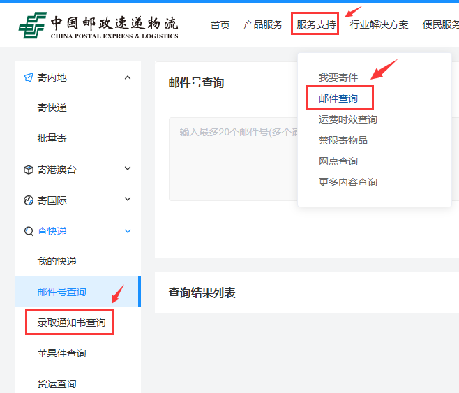 考生也可直接百度“中国邮政速递物流”,点击菜单“服务支持”“邮件查询”“查录取通知书”查询邮件信息!