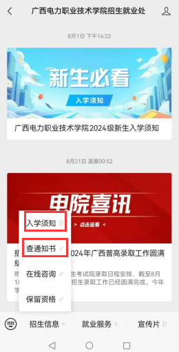 8月28日,学校已寄发全部考生的录取通知书。考生可通过关注“广西电力职业技术学院招生就业处”微信公众号查询邮件信息并查阅《2024级新生入学须知》,于9月8日到学校报到!