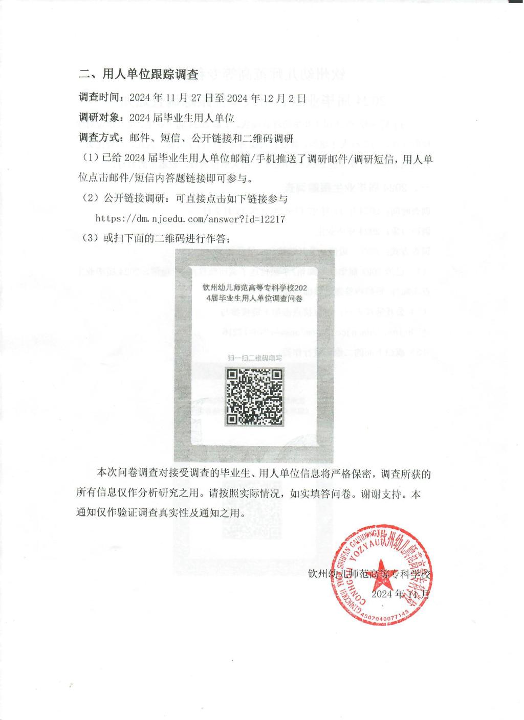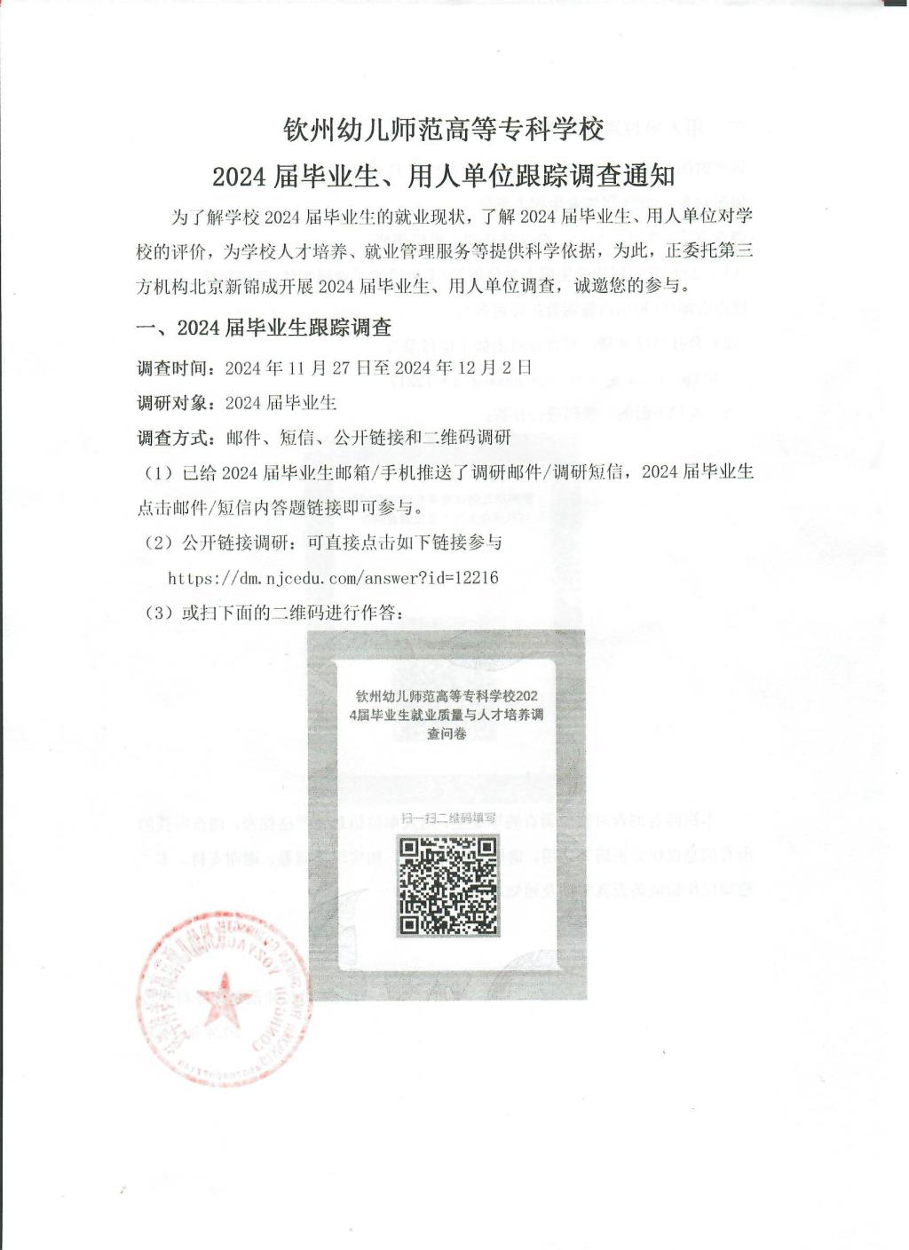钦州幼儿师范高等专科学校2024届毕业生、用人单位跟踪调查通知