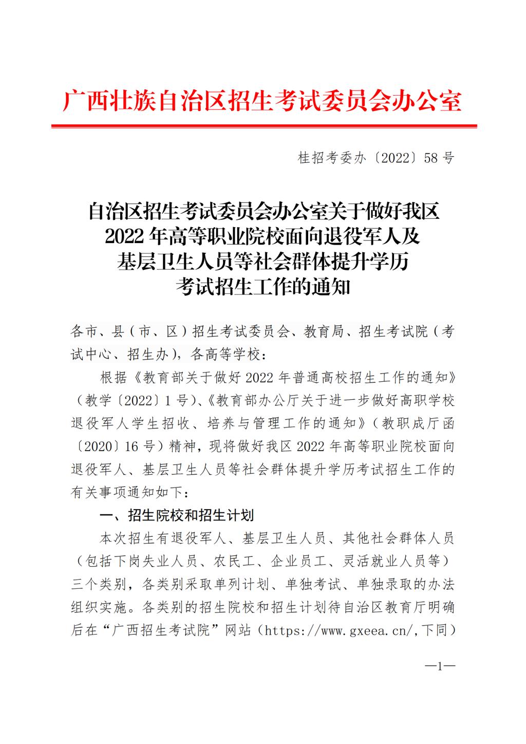 自治区招生考试委员会办公室关于做好我区2022年高等职业院校面向退役军人及基层卫生人员等社会群体提升学历考试招生工作的通知