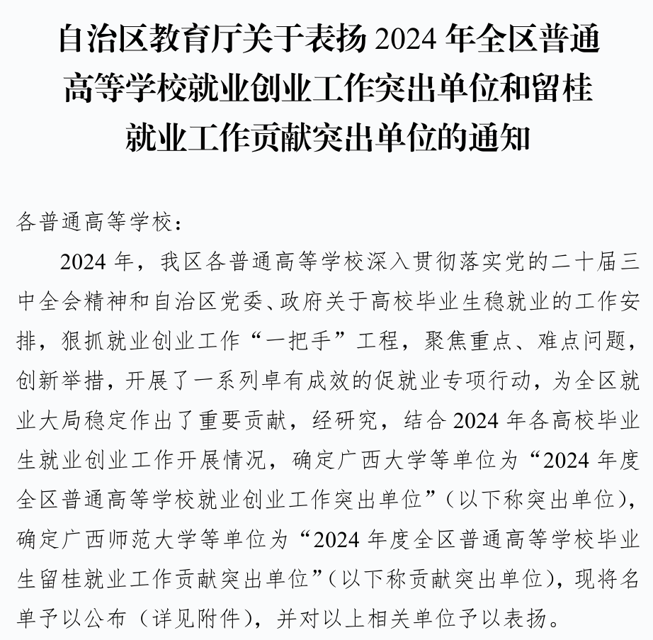 近日,广西壮族自治区教育厅下发《自治区教育厅关于表扬2024年全区普通高等学校就业创业工作突出单位和留桂就业工作贡献突出单位的通知》(桂教学生〔2024〕25号),我校荣获2024年“全区普通高等学校就业创业工作突出单位”。