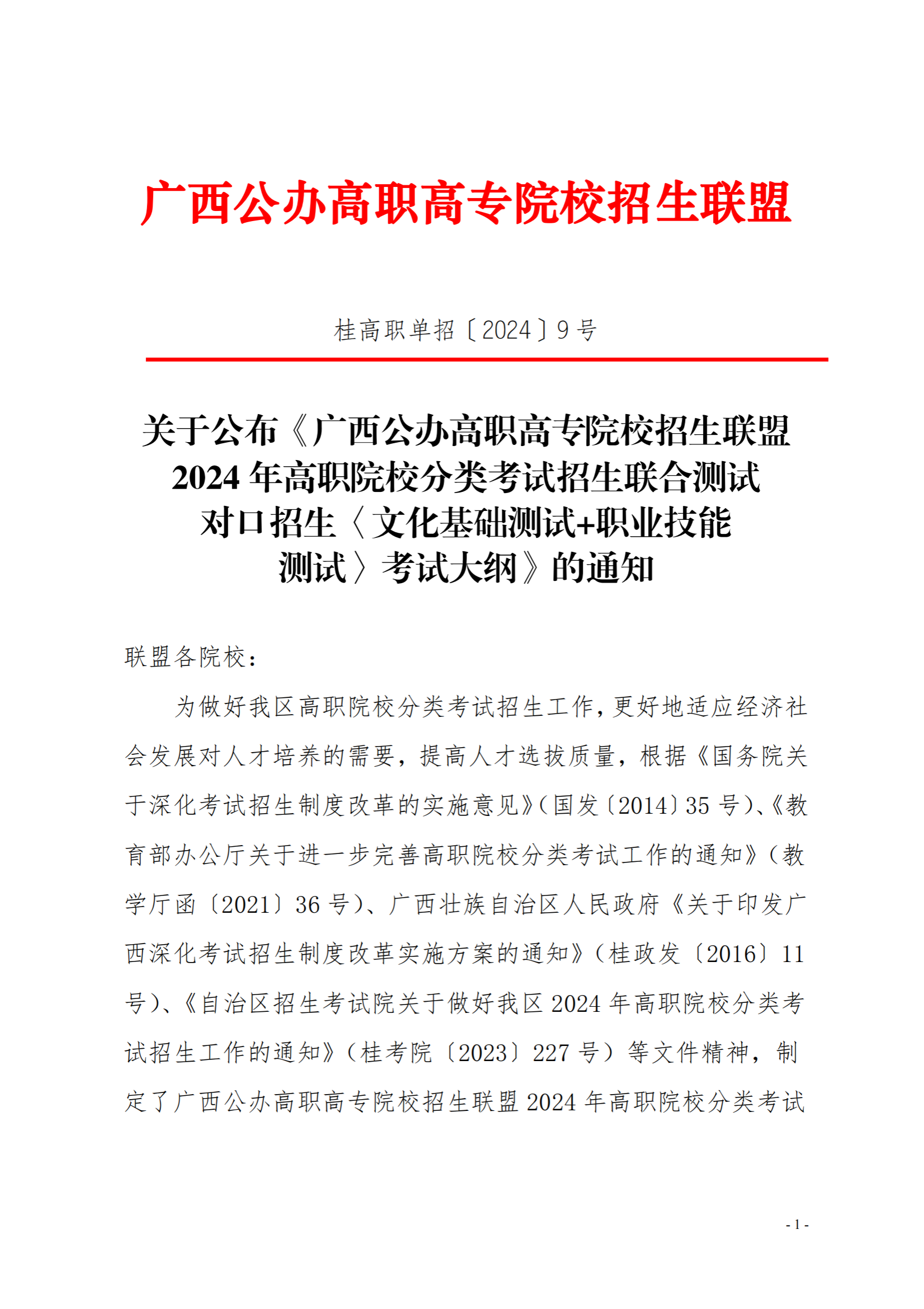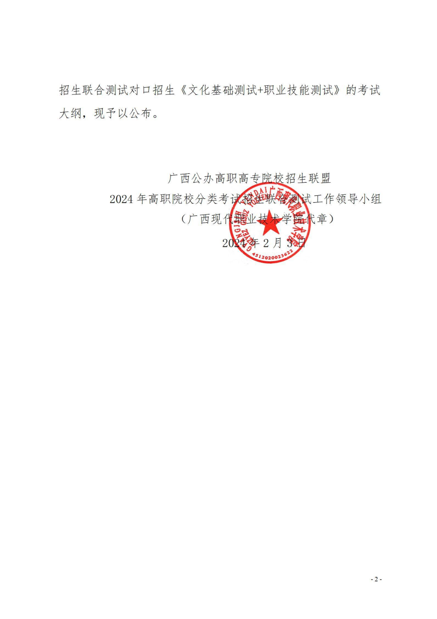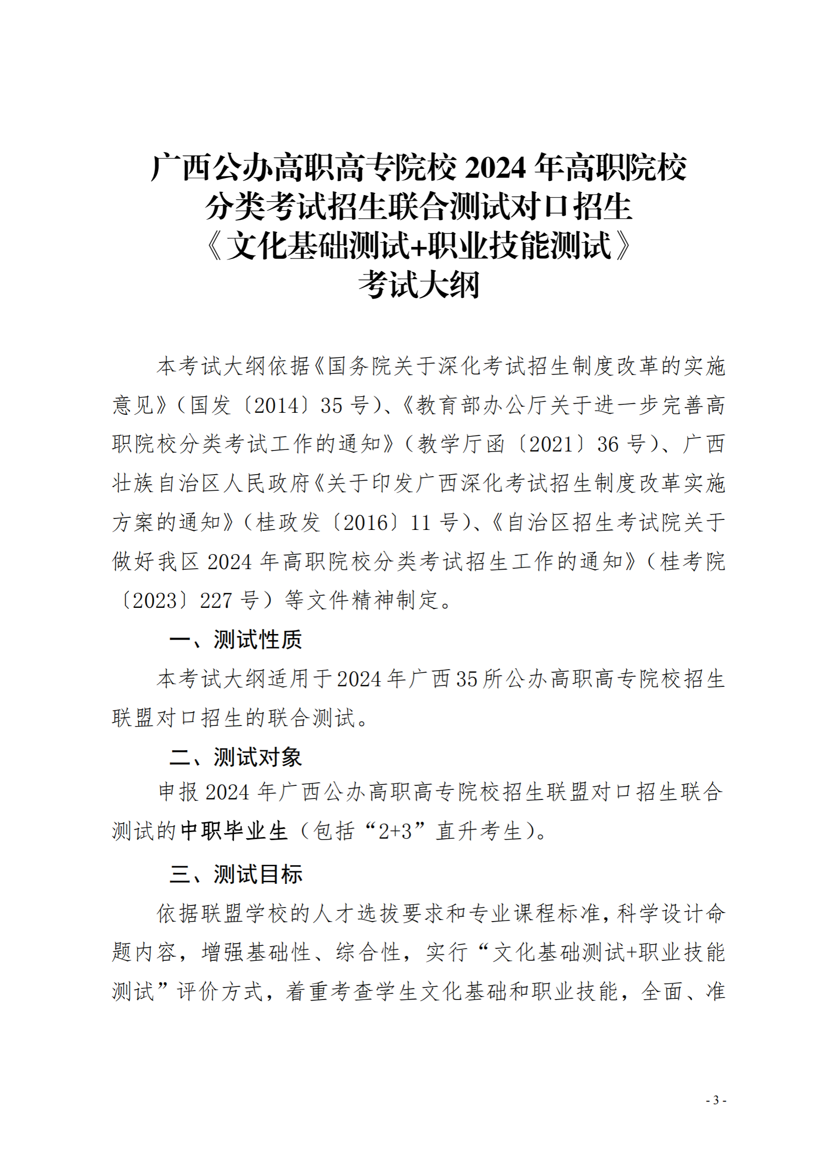 《广西公办高职高专院校招生联盟2024年高职院校分类考试招生联合测试对口招生〈文化基础测试+职业技能测试〉考试大纲》
