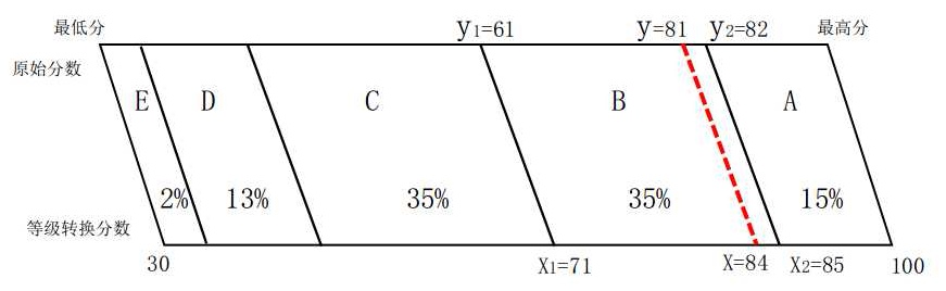 (二)分数转换。成绩转换时以30分作为赋分起点,满分为100分。将A至E五个等级内的考生原始分数,依照等比例转换方法,分别对应转换到100~86、85~71、70~56、55~41和40~30五个分数区间,得到考生的等级转换分数。等级转换分数计算结果按“四舍五入”进行处理,以整数呈现。等级转换分数一分一档,与原始分数排序保持不变。