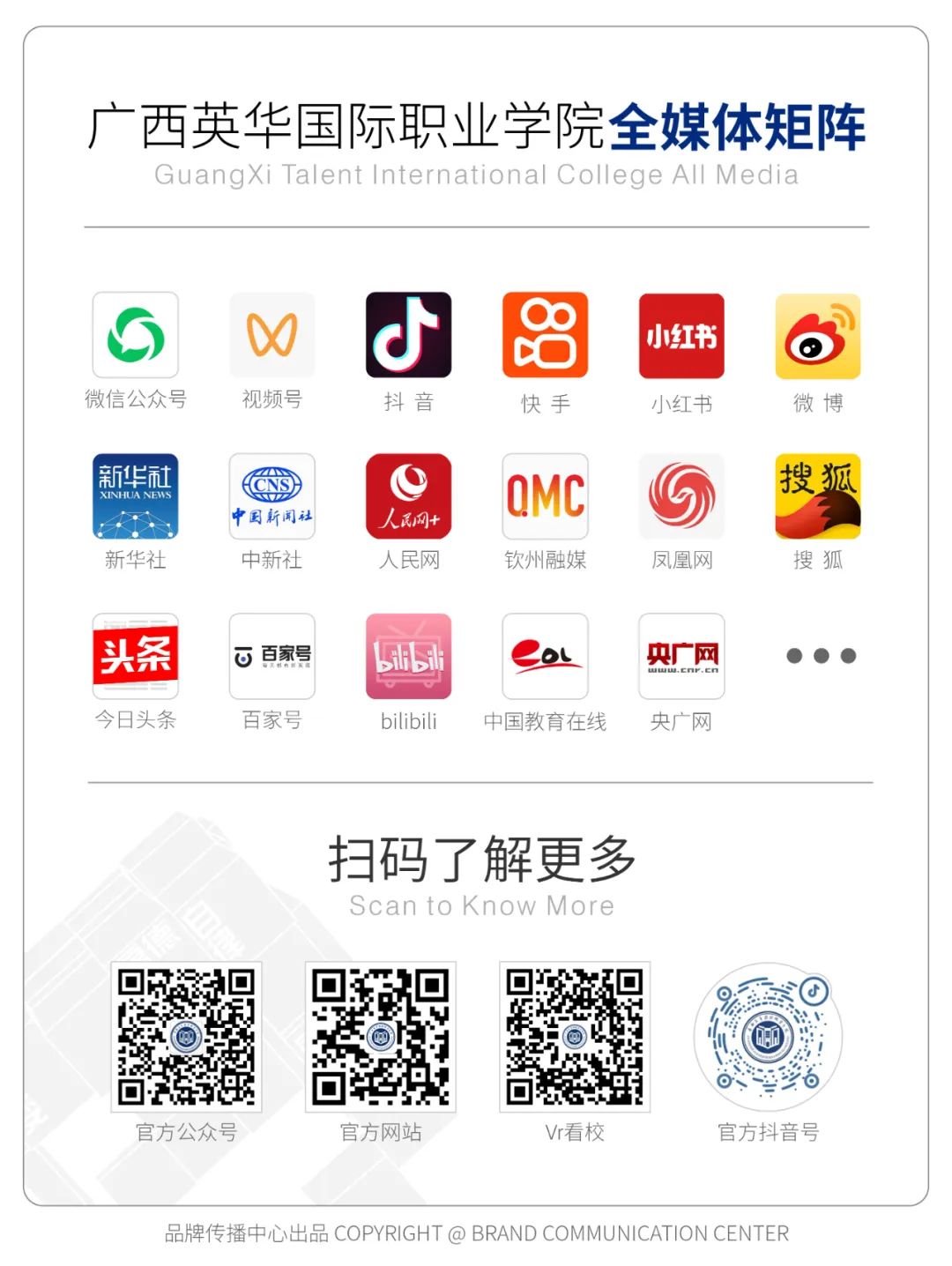 来源 SOURCE广西高校联盟信息网招生办公室撰文 WRITER/排版 EDITOR宋钦宁设计 DESIGN蒋红霞图片 PICTURE/摄影PHOTOGRAPHY翁华江剪辑 CLIP/摄像 CAMERA梁正慧校对 PROOF宋钦宁责编 RESPONSIBLE EDITOR安娜陈广晓赵春辉版权 COPYRIGHT图文由@广西英华国际职业学院品牌传播中心 编辑整理,如需转载,请与工作人员取得联系。