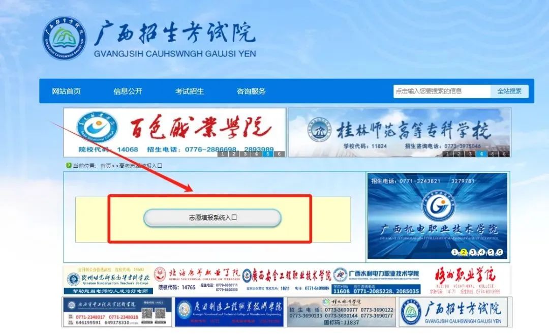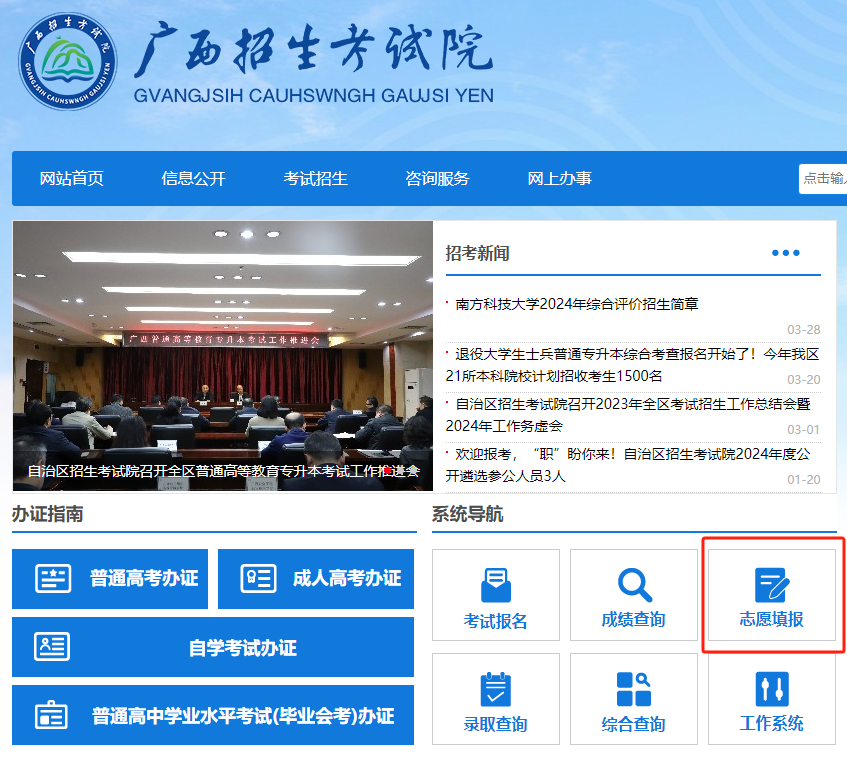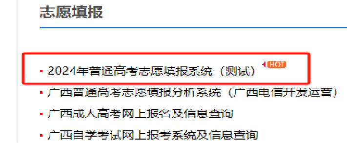 考生登录“广西招生考试院”网站,根据“系统导航—志愿填报—2024年普通高考志愿填报系统”进入系统。