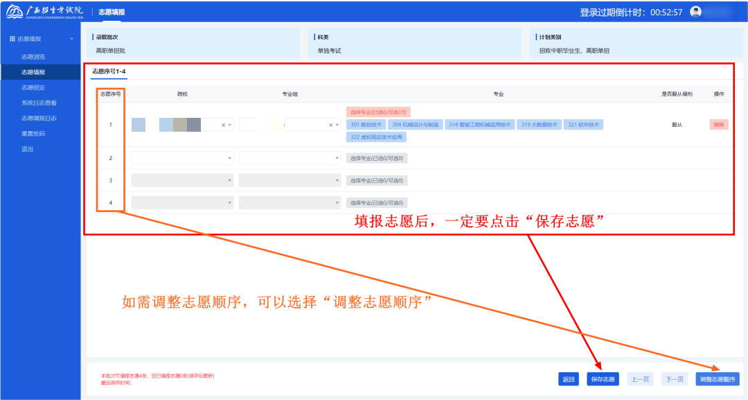 所有报考高职单招/对口的考生本人需通过自治区招生考试院志愿填报系统填报志愿,才能获得录取机会,没有填报志愿的考生将视为放弃高职单招或高职对口中职自主招生资格。