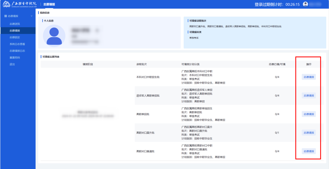 因此,建议考生先将有关志愿信息(院校代号、院校名称、专业代号、专业名称等)记录好后,再登录系统按整理好的内容进行填报。超过15分钟的,系统将自动退出,如需继续填报志愿,须重新登录。