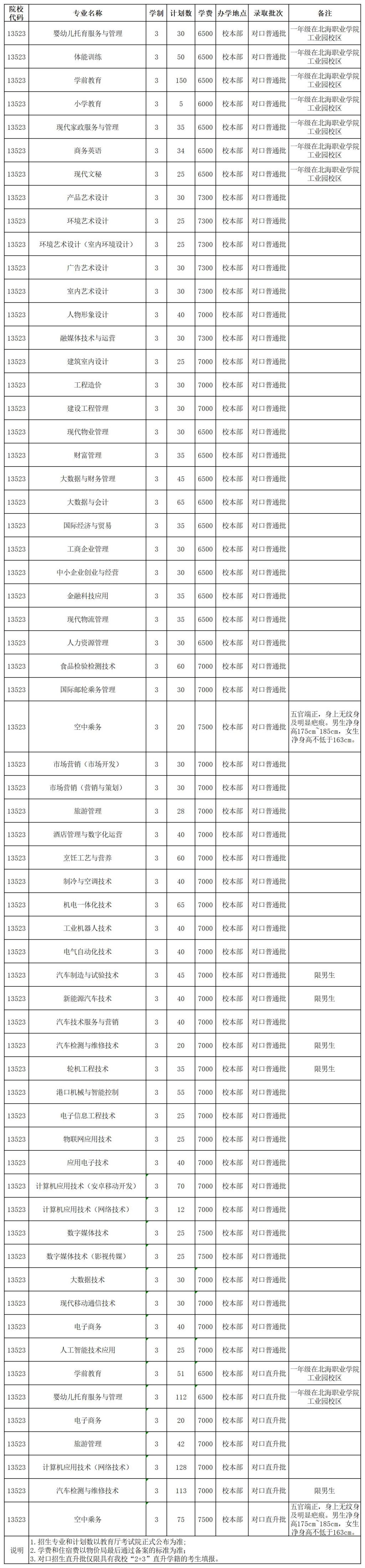北海职业学院2024年高职对口招生计划