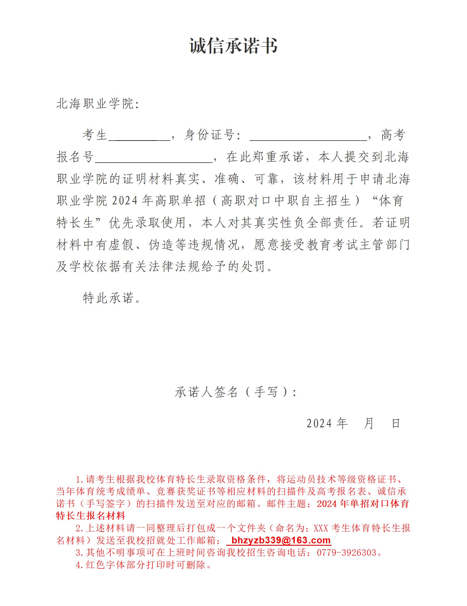 北海职业学院体育特长生材料申报《诚信承诺书》下载