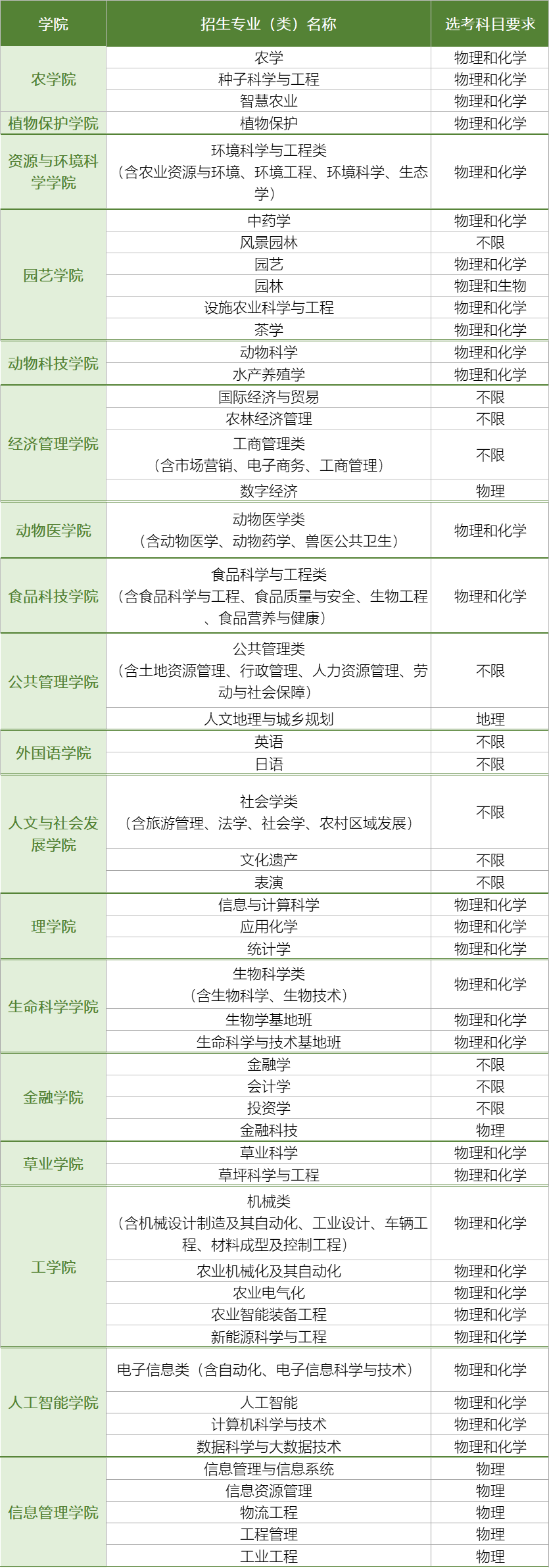 南京农业大学2024年招生专业(类)及选考科目要求一览表