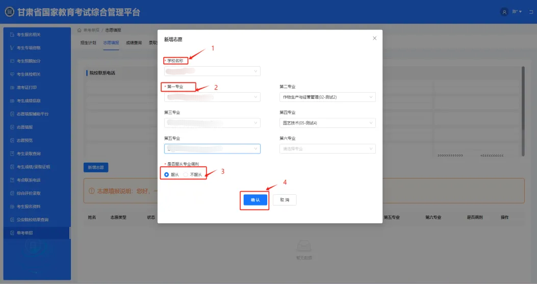选择学校→选择专业→选择是否服从调剂(是否服从调剂默认为否)→点击确定