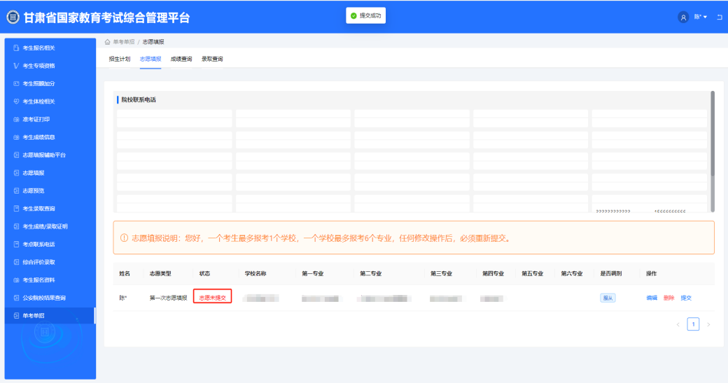 点击确认后,如下图所示,新增志愿点击确认后,只是保存了志愿。一定要进行下一步操作------提交志愿。