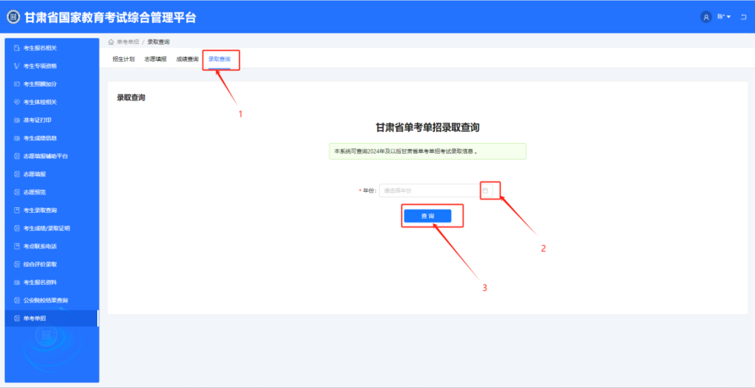在录取结果查询时间段内,点击录取查询,进行单考单招录取结果的查询。
