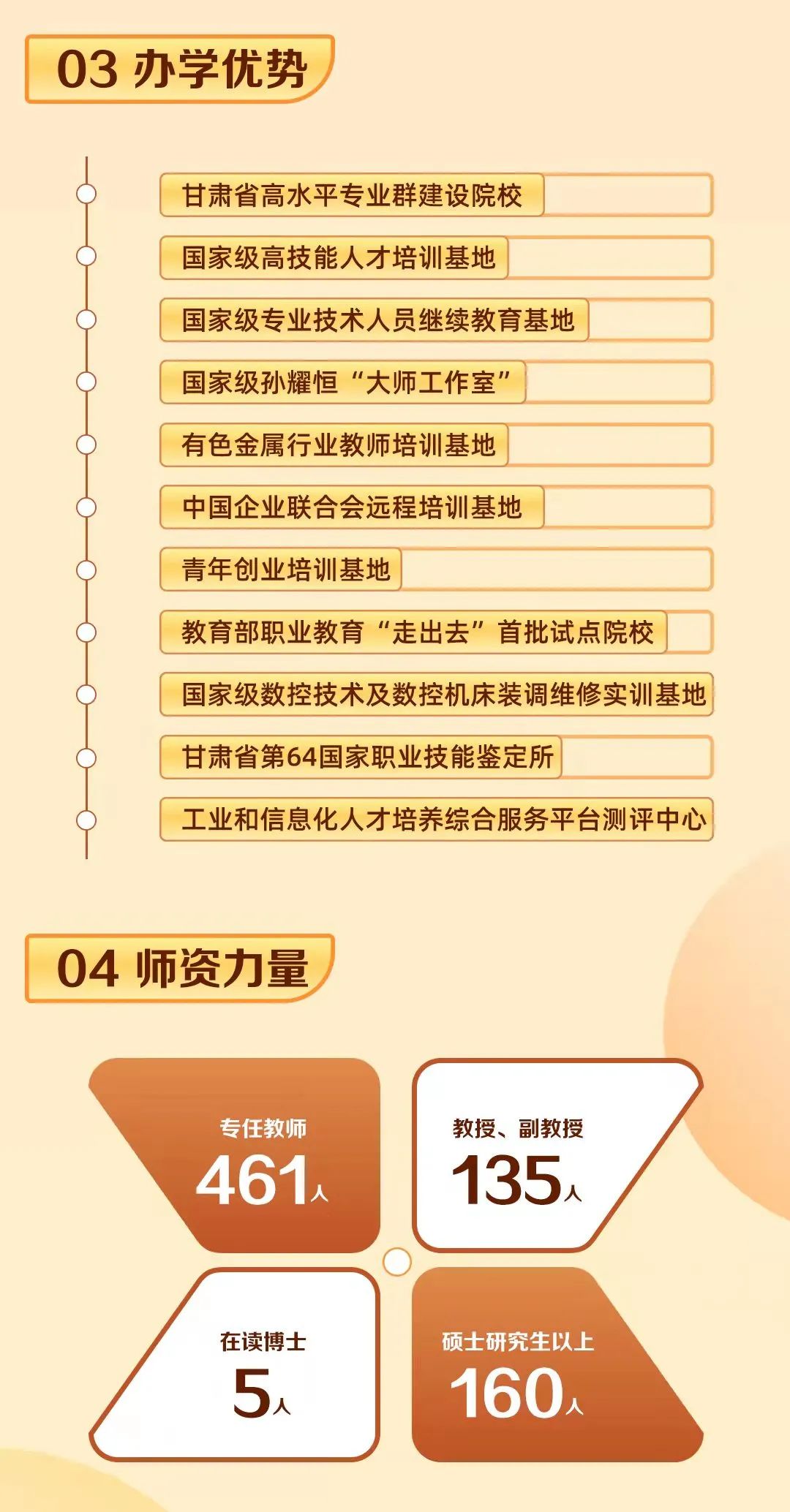1.报名时间、方式:根据省教育考试院规定的报名时间进行报名。具体时间在高考结束后可登录省教育考试院网站查询。2.招生条件:符合我省报名条件、具有省内中等职业学校(包括甘肃省内技工学校、技师学院)学籍的应往届毕业生。非省内中等职业学校(含技工学校)学籍的中职应往届毕业生不得参加中职升学考试录取。3.评价方式文化素质:文化素质包括公共基础和专业基础两部分。公共基础考试以语文、数学、英语和德育四门课程为主;专业基础考试按照省教育厅公布的考试大纲划分为8个专业类别(农林牧渔类、医药卫生类、工业类、土木水利类、信息技术类、财经商贸类、旅游服务类、教育与文化艺术类),以各专业的三门基础课程为主。职业技能:以中职生在校期间参加国家、省、市、县(区)、校级职业院校学生技能大赛成绩为准(学生参加人力资源和社会保障部或教育部指定全国行业协会、教指委组织的职业技能大赛,其成绩可转换为相应职业技能测试成绩)。技能大赛成绩三年以内(含三年)有效,超过三年需重新测试。4.学制:三年。(四)统招录取(文史类、理工类)