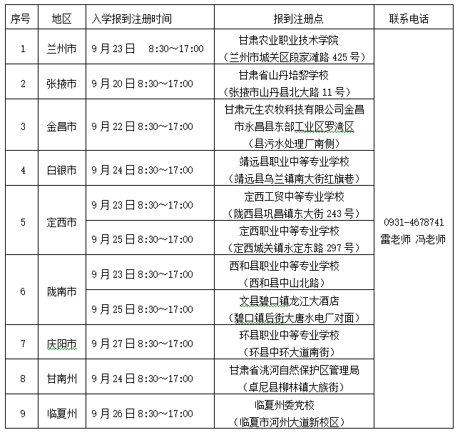 录取新生请按照以下安排,在规定时间持录取通知书、身份证选择就近报到点报到注册;由于涉及注册及教学安排等重要事宜,一般不予请假。确因特殊原因不能按时报到注册者,应致电我院乡村振兴学院请假(0931-4678741),未请假逾期没有报到者,视为自动放弃入学资格。