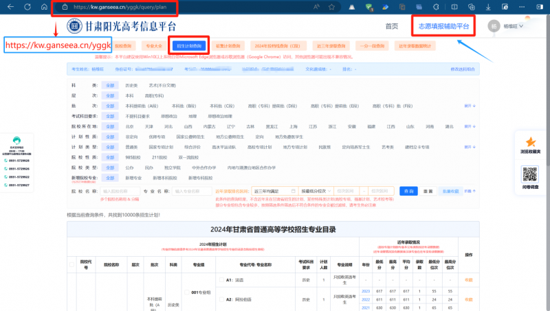 或访问甘肃阳光高考信息平台:https://kw.ganseea.cn/yggk,登录后进入“志愿填报辅助平台”模块,点击“招生计划查询”查看计划信息。