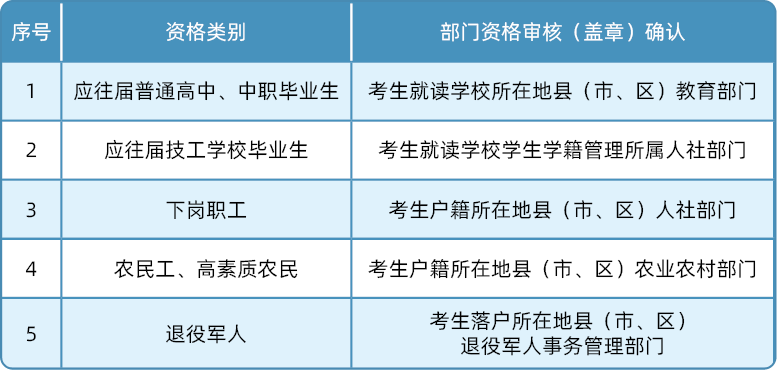应往届普通高中和中职毕业生报名资格由考生就读学校所在地县(市、区)教育部门统一确认。应往届技工学校毕业生报名资格由考生就读学校学生学籍管理所属人社部门统一确认。下岗职工报名资格由考生户籍所在地县(市、区)人社部门统一确认。农民工、高素质农民报名资格由考生户籍所在地县(市、区)农业农村部门统一确认。退役军人报名资格由考生落户所在地县(市、区)退役军人事务管理部门统一确认。