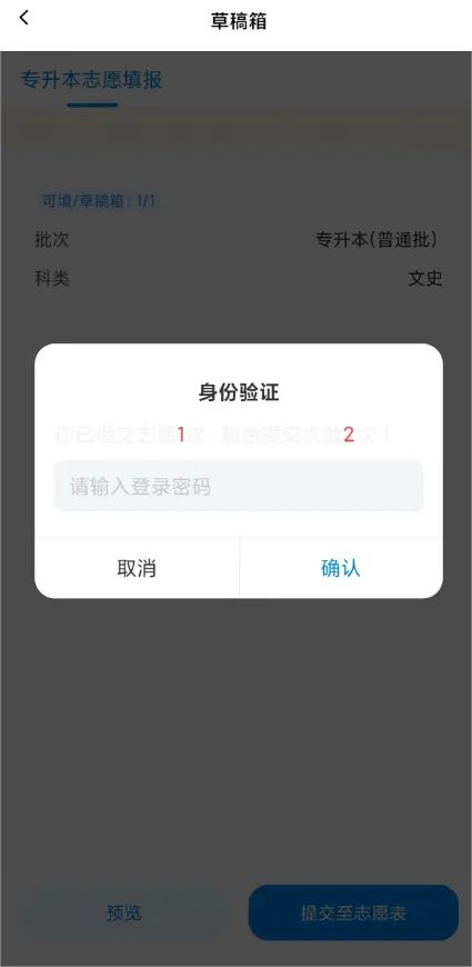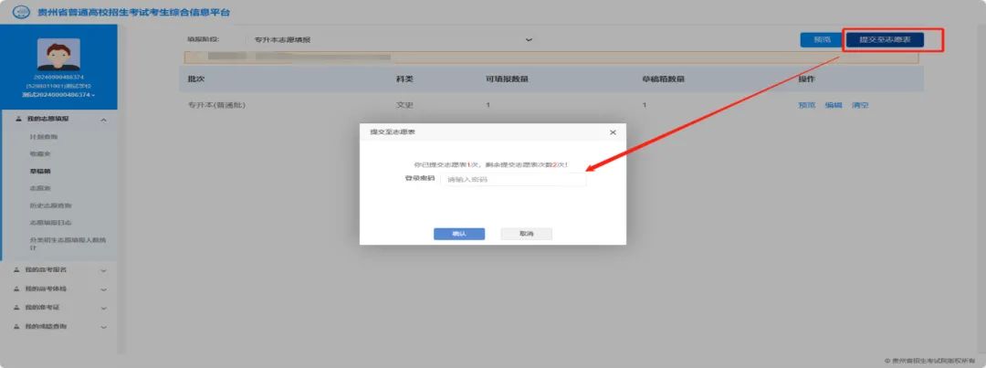 考生确认所填写志愿草稿准确无误后,须点击【草稿箱】→【提交至志愿表】,输入登录密码进行确认,确保提交成功后志愿方可生效。