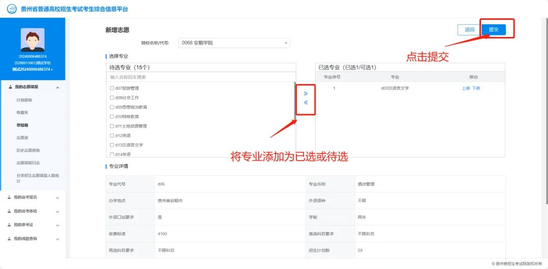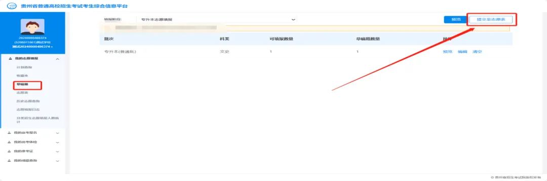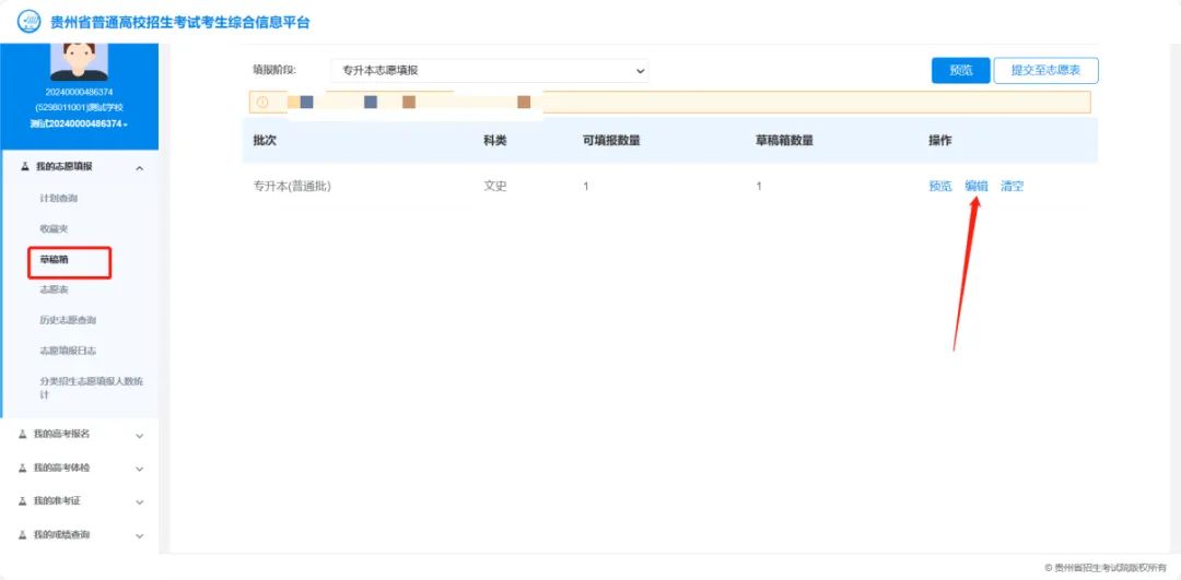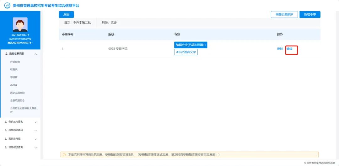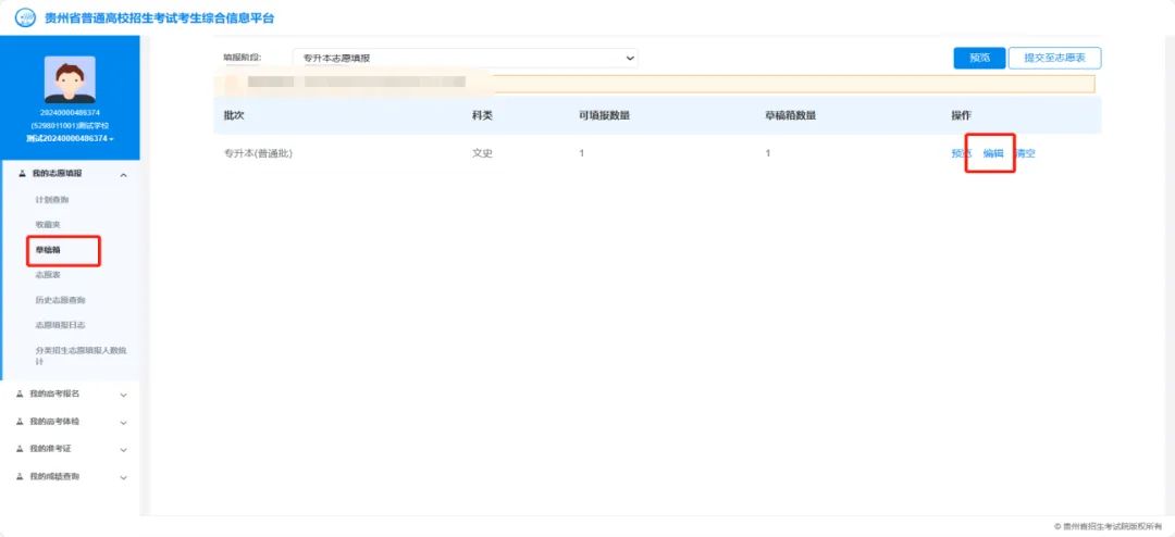 通过【草稿箱】→【编辑】功能,编辑志愿草稿,进行专业调整和确认,点击“提交”完成编辑。