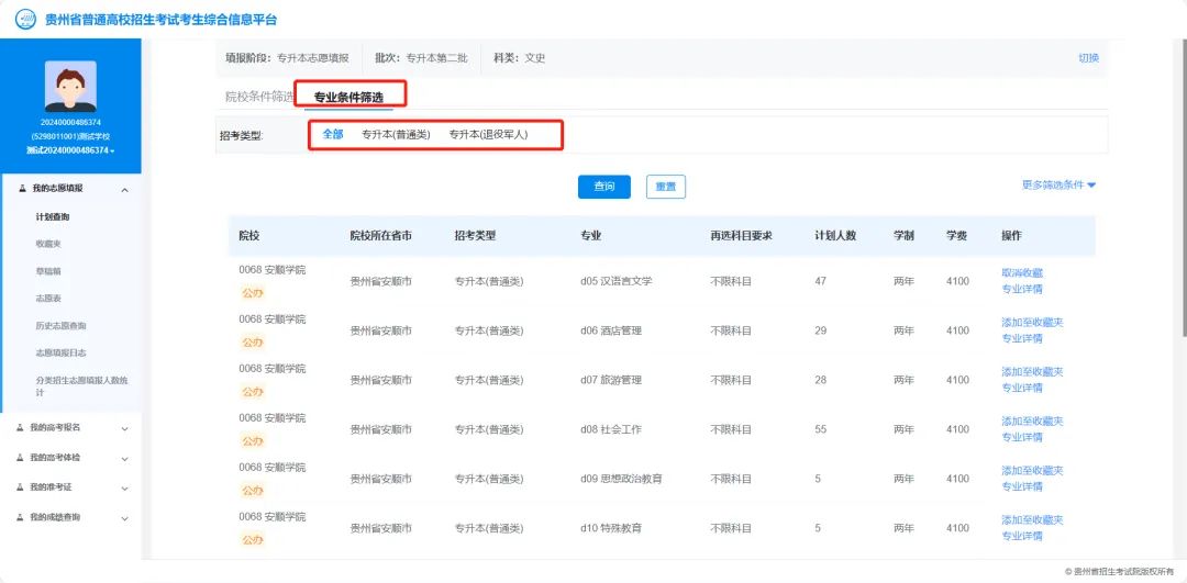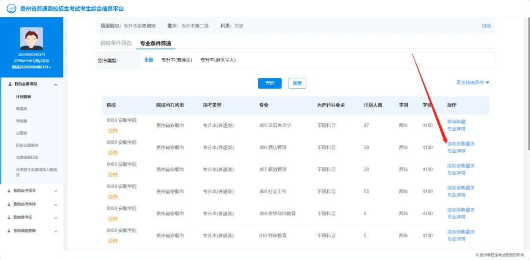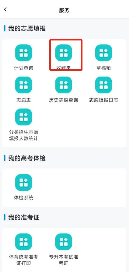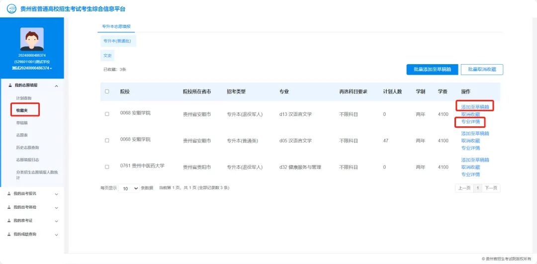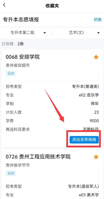 方式1:通过【服务】→【我的志愿填报】→【收藏夹】进入收藏夹页面,在志愿下方点击【添加至草稿箱】按钮,可将该条计划添加至草稿箱。