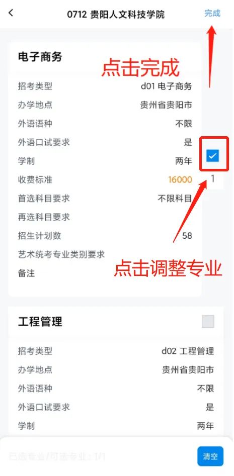 进入【草稿箱】,点击【已选/可选专业】可进入专业选择页面,点击右上角【选择】后,可进行专业调整及确认。