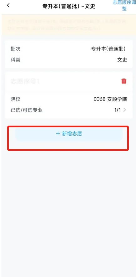 如草稿已存在1个志愿,则不能添加其它志愿。如需添加其它志愿,须先清空原有志愿。