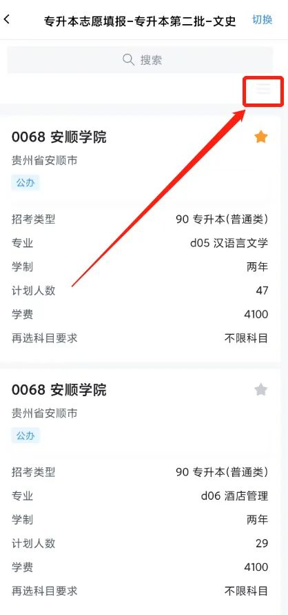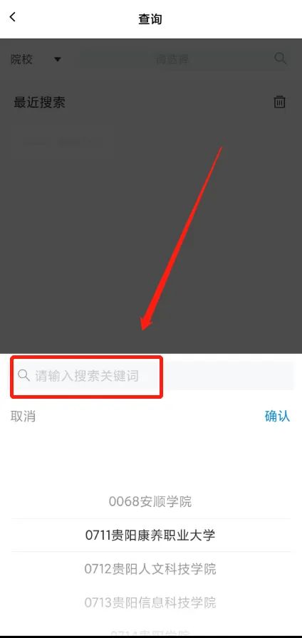 考生进入计划查询界面后,点击页面上方【搜索】框,进入院校/专业筛选查询页面。