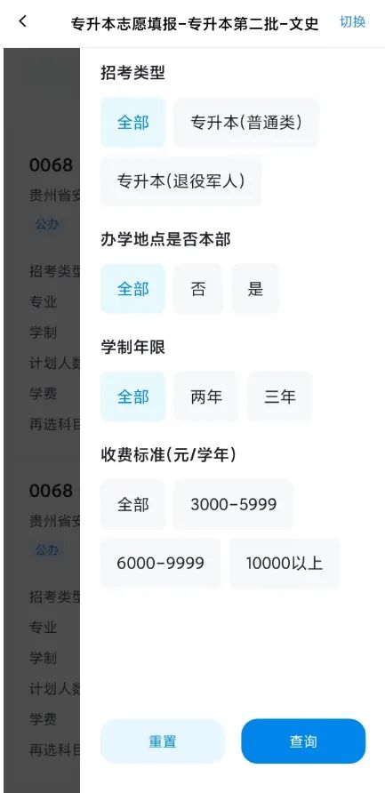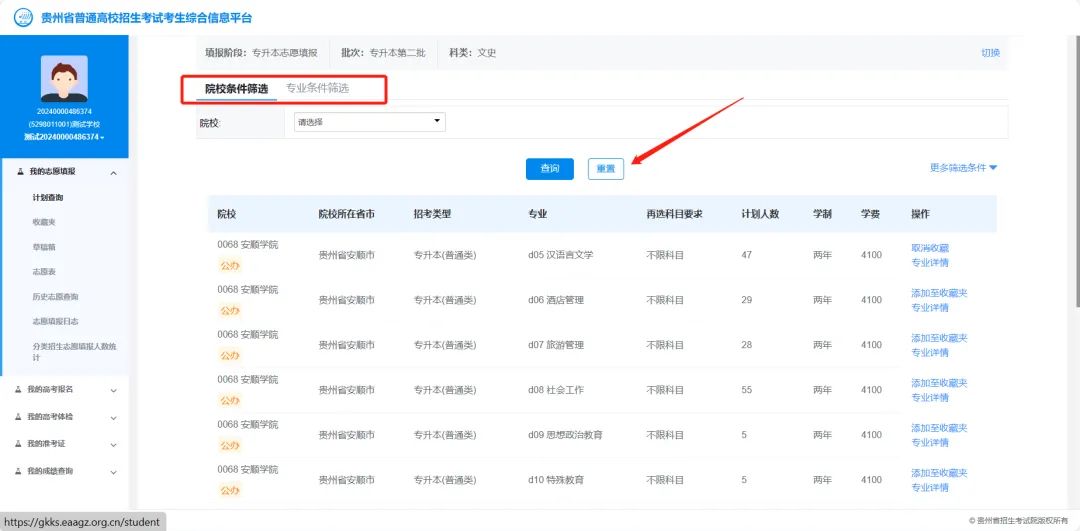 注:“院校条件筛选”和“专业条件筛选”为联动查询,筛选院校后再筛选专业,查询结果为筛选院校的对应专业。可点击“重置”按钮清空已选条件。