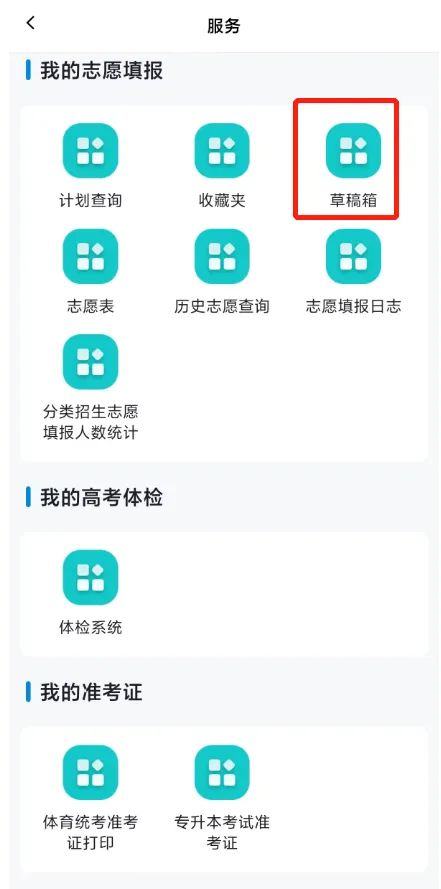 方式2:通过【服务】→【我的志愿填报】→【草稿箱】进入草稿箱页面,依次点击【可填/草稿箱】栏→【+新增志愿】按钮,选择相应的院校专业添加到草稿箱。