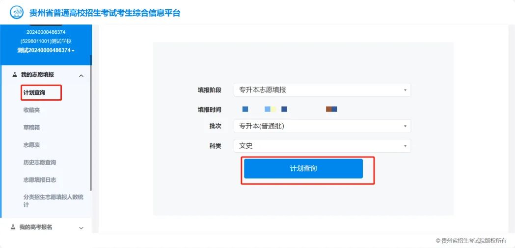 登录系统后,通过系统左侧的【我的志愿填报】→【计划查询】,查询院校专业计划。