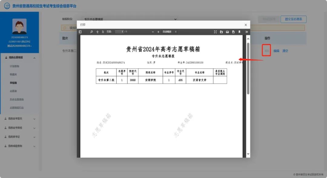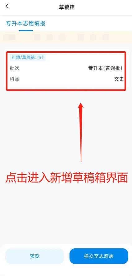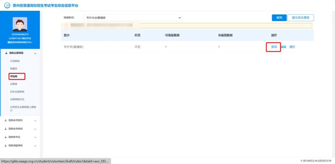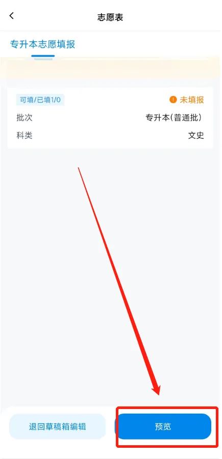 在草稿箱中添加志愿后,考生可通过【草稿箱】→【预览】功能,查看自己的“考生志愿草稿表”。