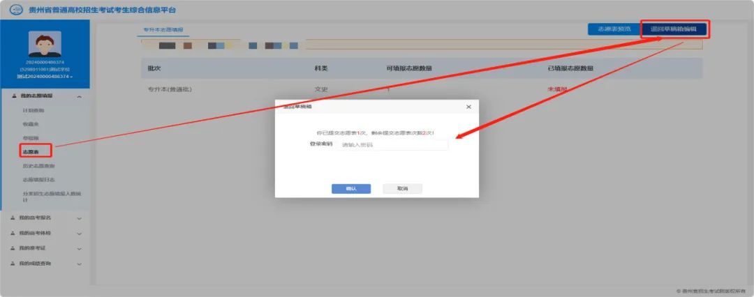 考生如需修改已提交志愿,可通过【志愿表】→【退回草稿编辑】,将已提交志愿退回至草稿箱,此时系统会提示已提交志愿表次数和剩余可提交次数。