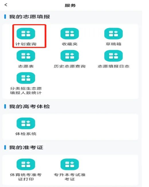 选择【服务】→【我的志愿填报】→【计划查询】,查询可填报的院校专业计划。