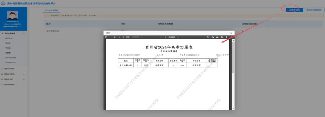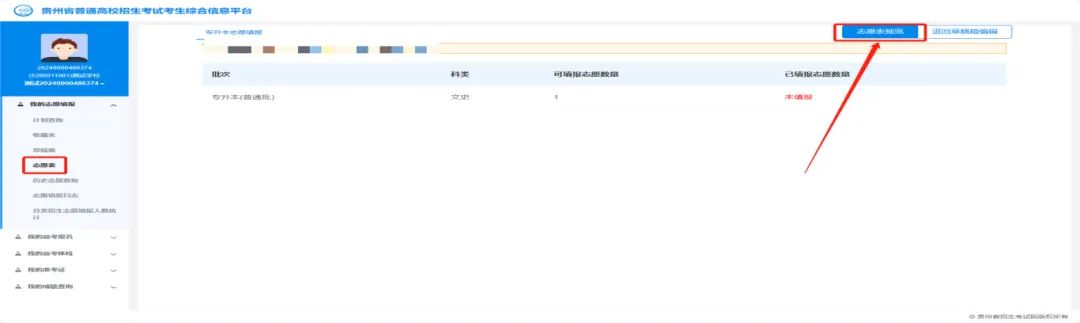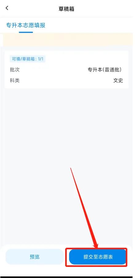 考生提交志愿草稿成功后,须点击【志愿表】→【志愿表预览】,查看和确认所填报的院校专业志愿是否提交成功。