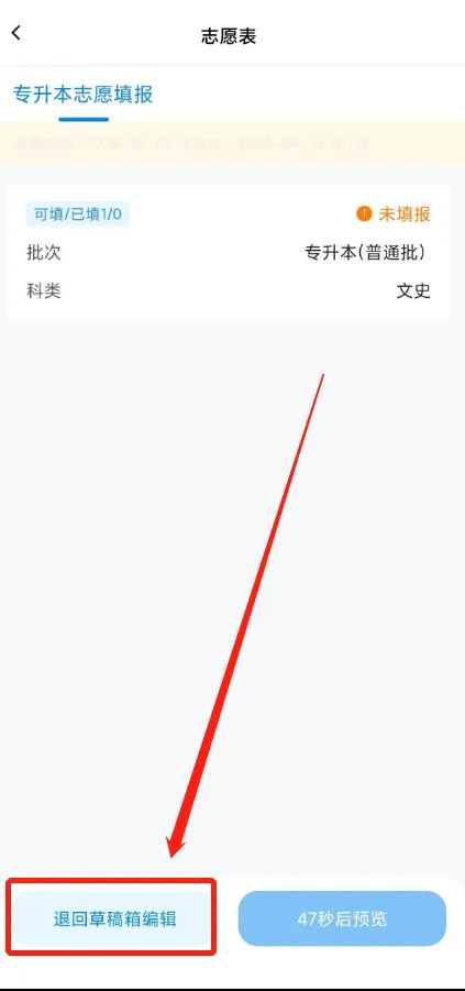 已提交志愿退回至草稿箱后,可在【草稿箱】中对志愿再次进行编辑,编辑结束后须再次进行提交。考生在志愿填报期间,最多可提交3次志愿,在填报时间截止后,所填报志愿不能进行任何修改。